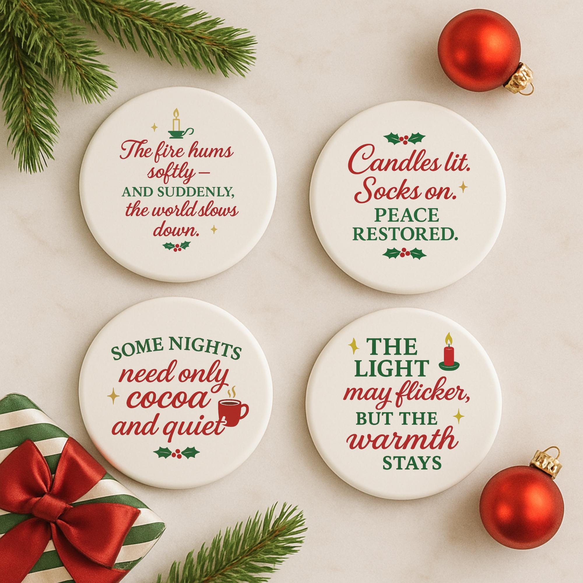 Cozy Christmas Coaster Set - Warm and Peaceful Holiday Coasters for Cocoa, Coffee and Candlelight Nights
