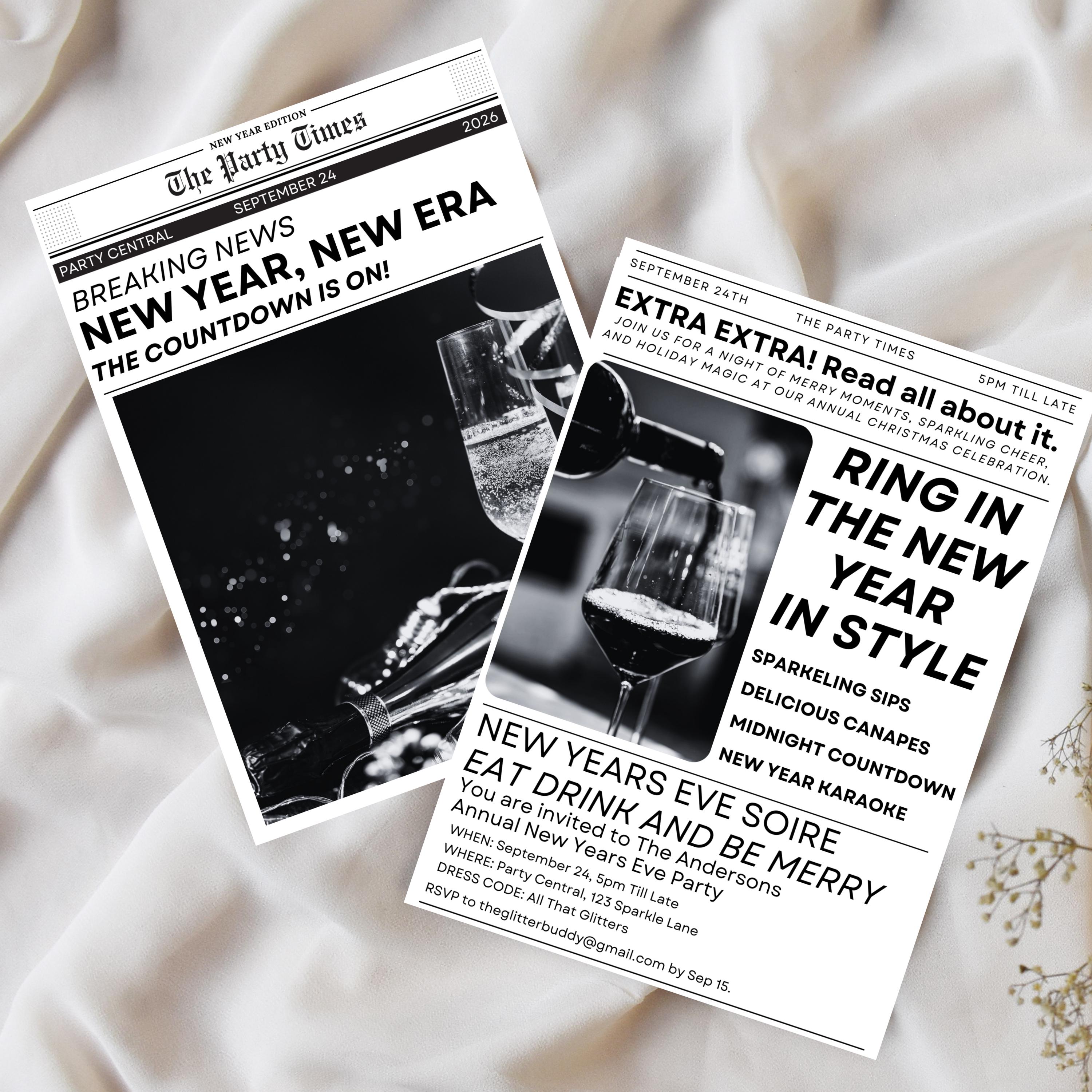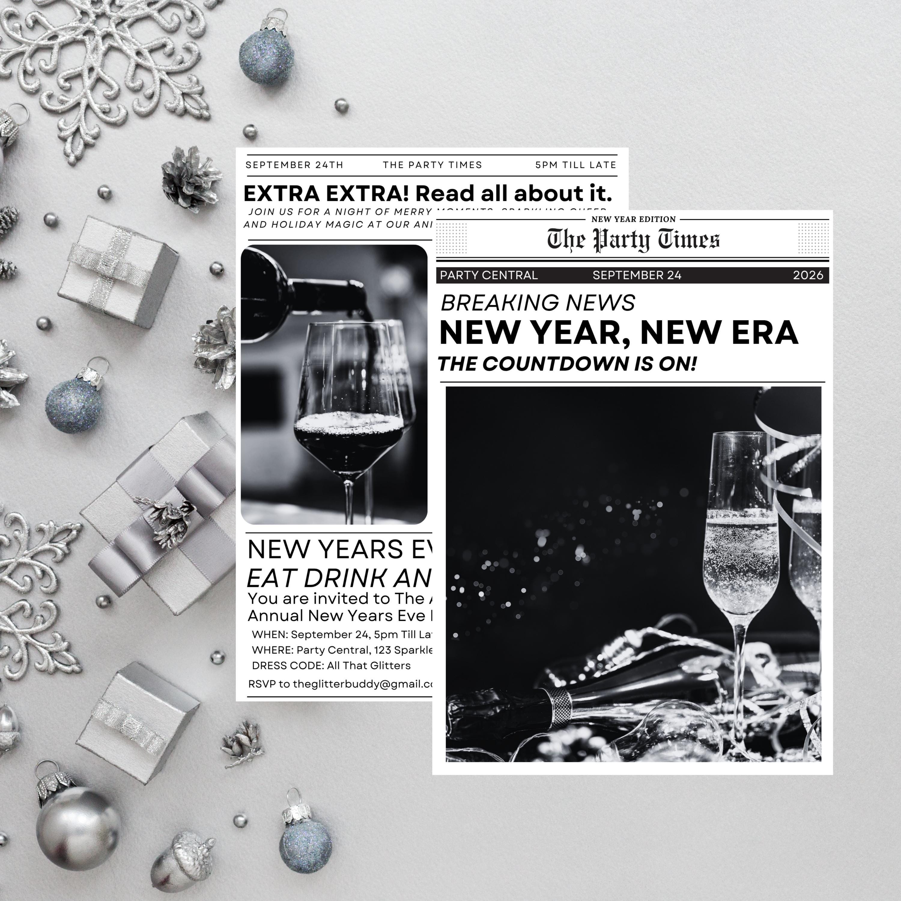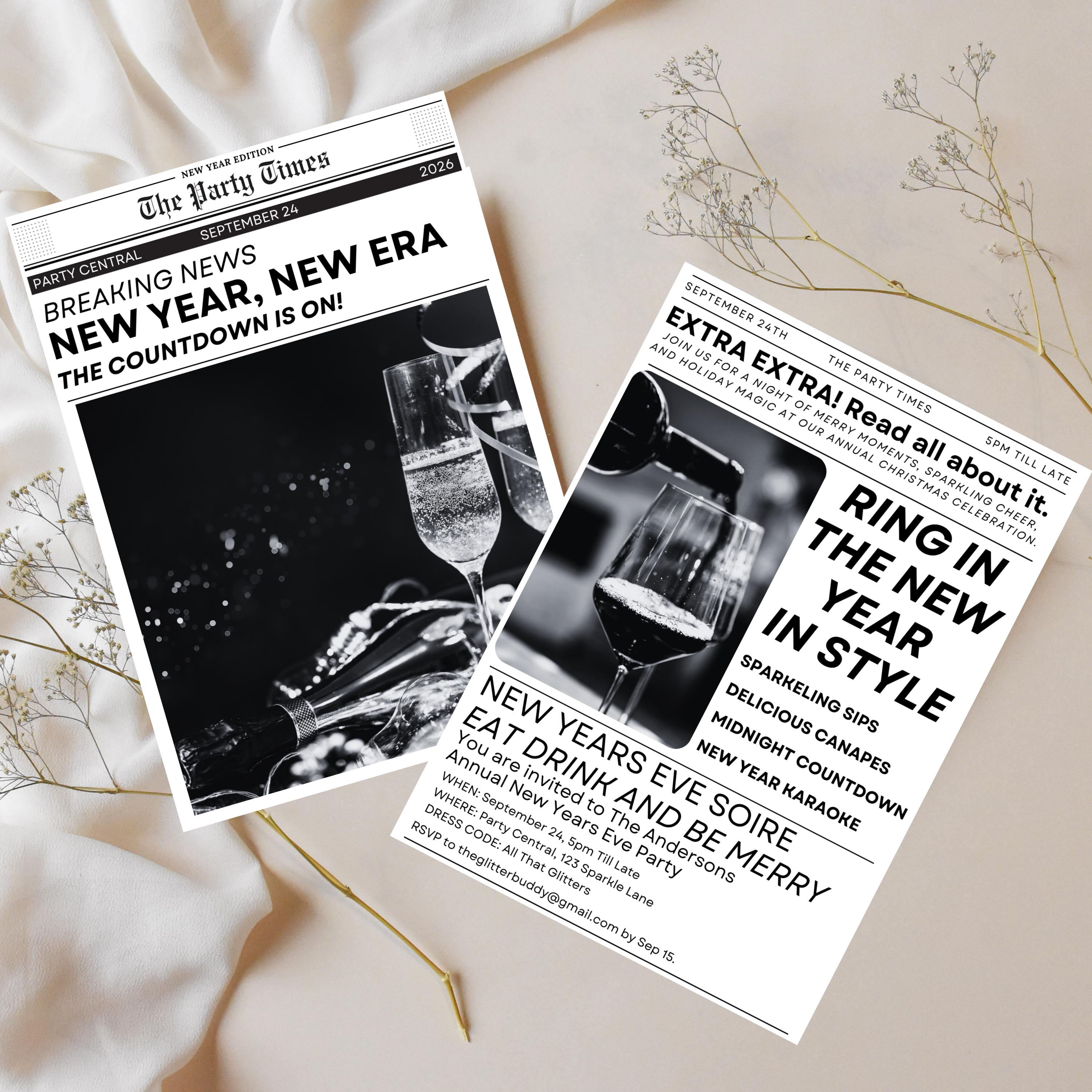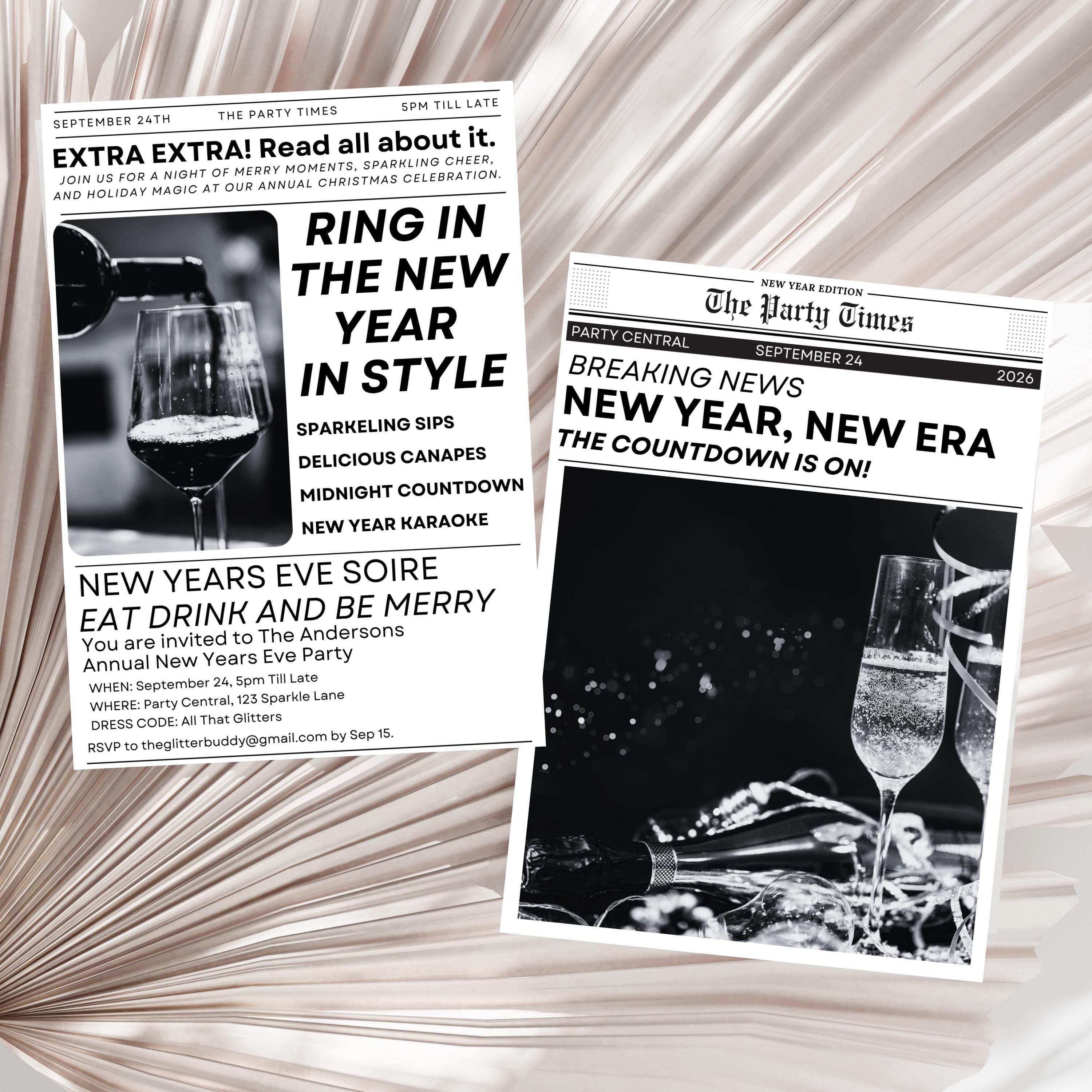 newspaper new year invitation, newspaper new year invite, editable new year evite, newspaper style new year card, trendy new years eve invitation, new year evite, new year party invite, vintage newspaper invitation, editable nye invite, printable new year invitation, new year announcement invite, modern new year invitation, digital new years eve invite, new year celebration evite, newspaper themed invitation, new years eve printable, 2026 new year invite, editable event invitation, new year digital card, vintage style party invitation