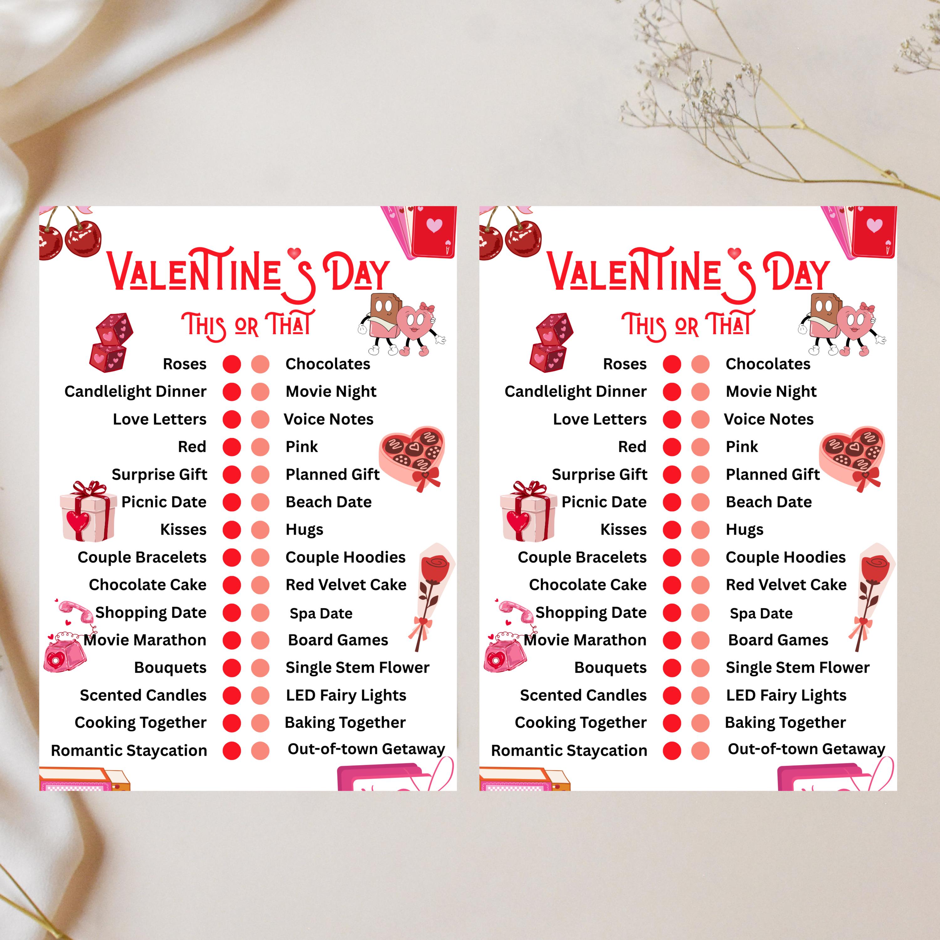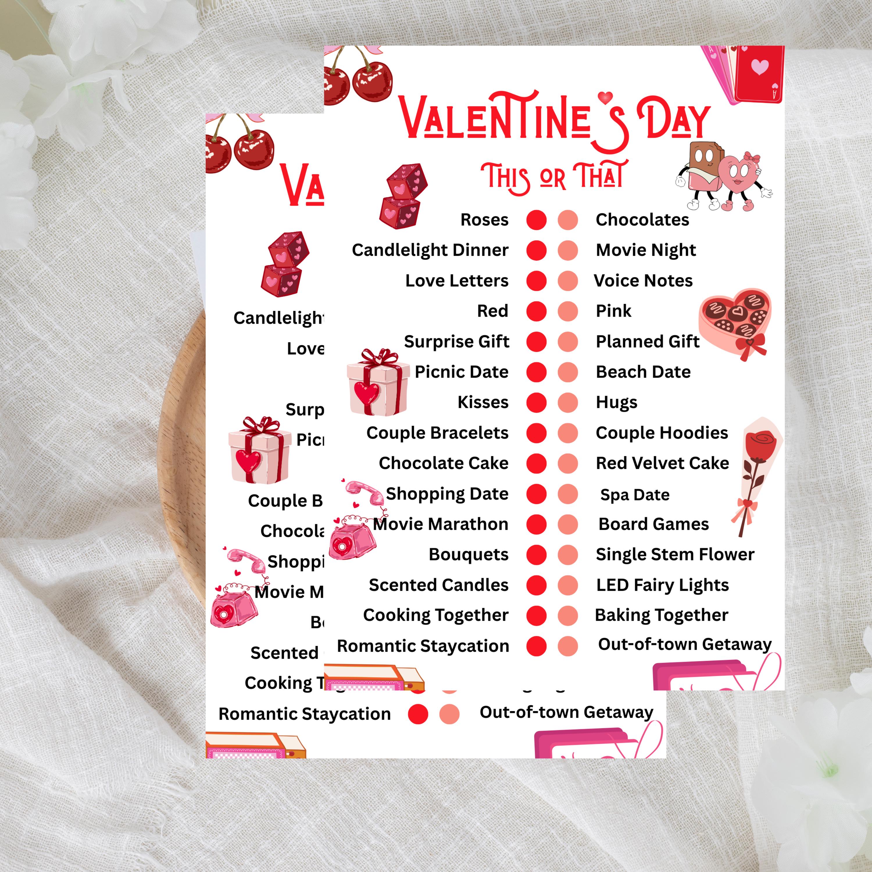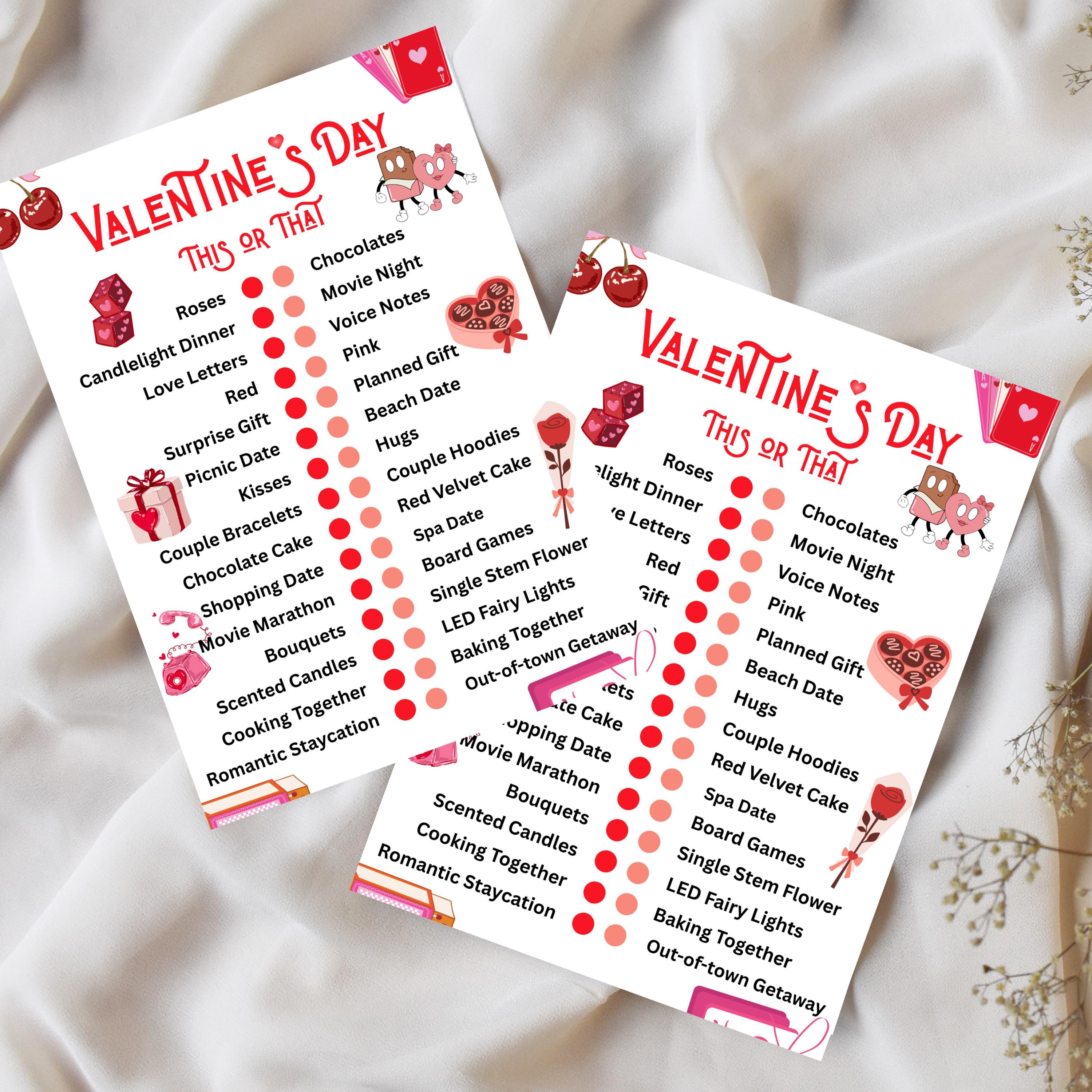 Valentine's Day This or That Game, Printable Val Activity (PDF), Valentine Pintable Game