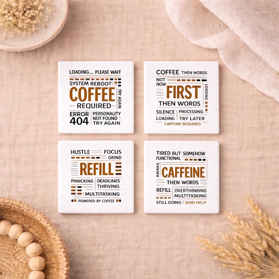 funny coffee coaster set, caffeine required decor, office desk decor, coffee bar decor, ceramic coaster set, tech humor gift, coworker gift idea, work from home decor, bold typography decor, modern coffee decor, coffee lover gift, hustle grind decor, refill coffee sign, caffeine quote decor, home office styling, gift for coffee lover, quirky kitchen decor, everyday coffee humor, minimalist coffee decor, productivity gift idea, gift for him, gift for her, programmer gift, desk accessory decor