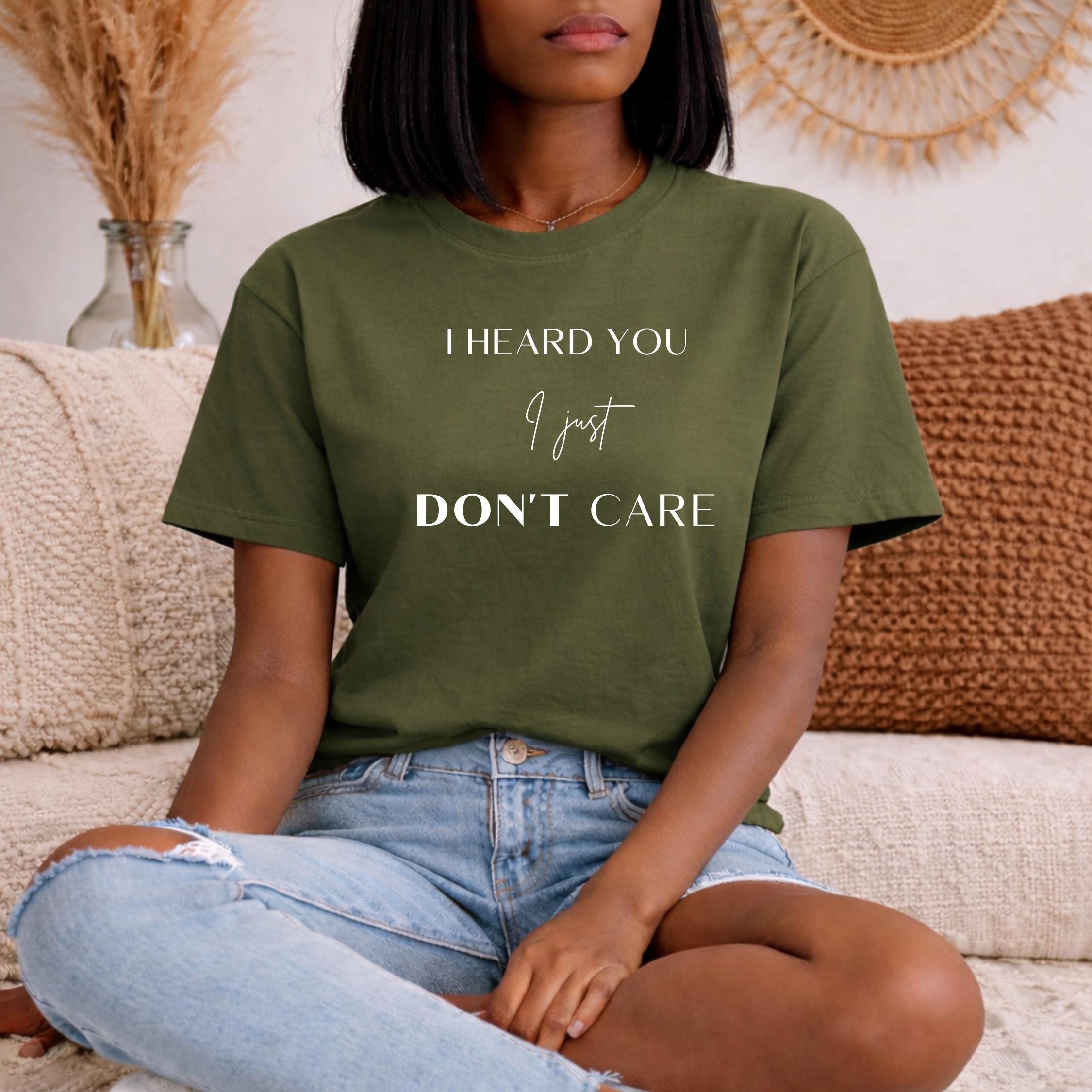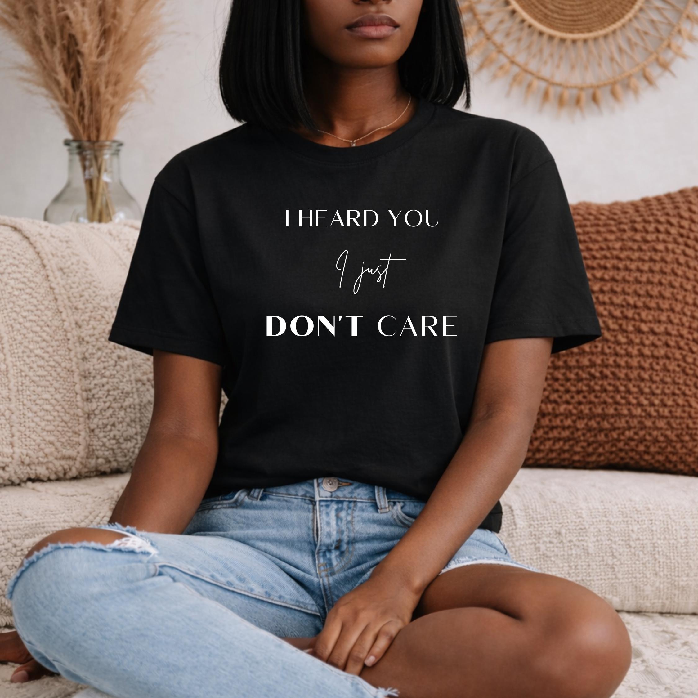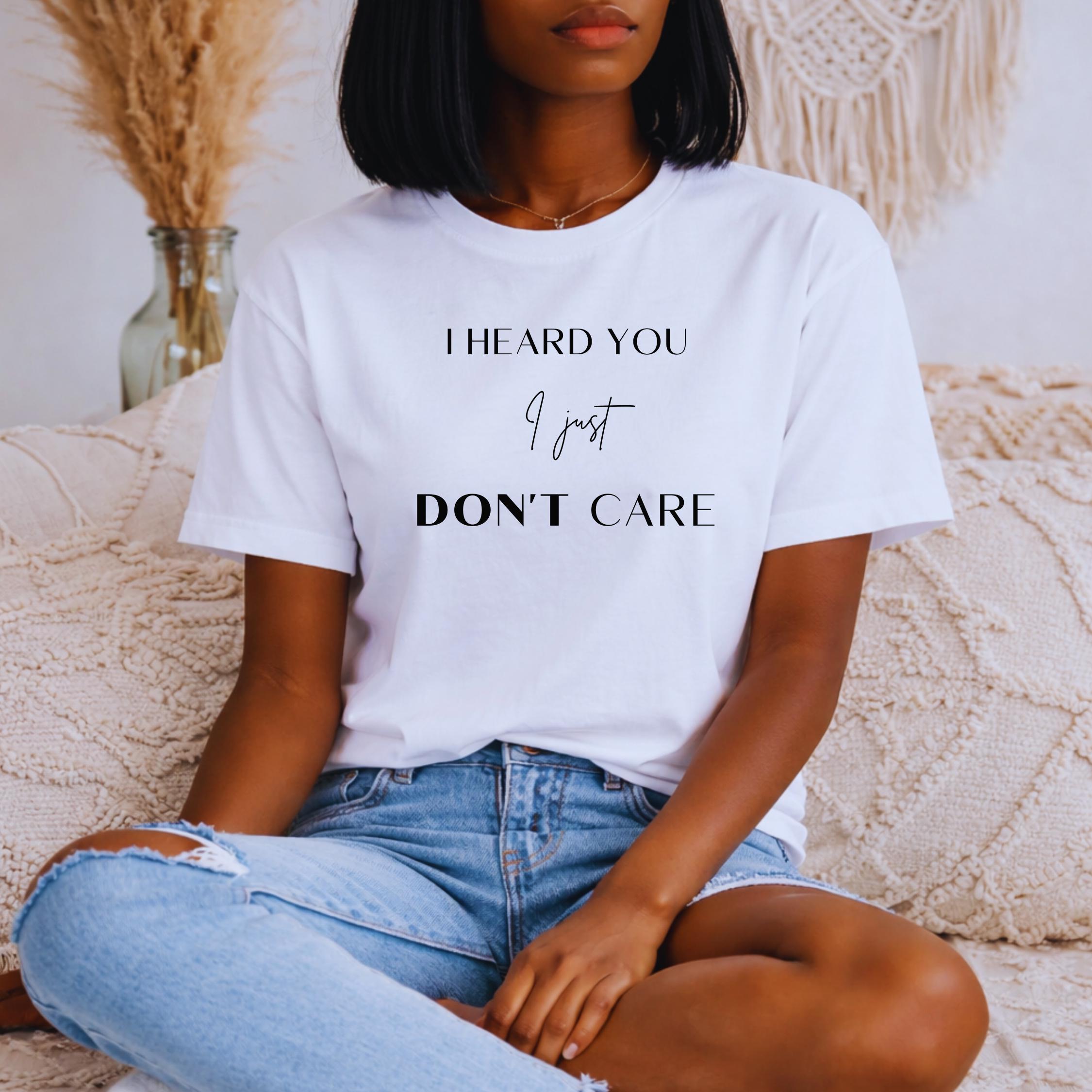 Make a bold and unapologetic statement with this I Heard You I Just Don't Care shirt. Designed with clean modern typography and a touch of sass, this shirt is perfect for anyone who appreciates humor confidence and a little sarcasm.
